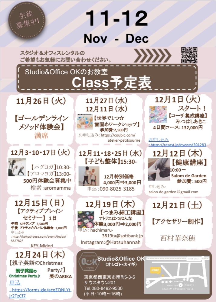 OK西東京 では、各先生方による講座が続々スタートしています!各講座、受付募集中!11月〜12月の講座ご案内です!