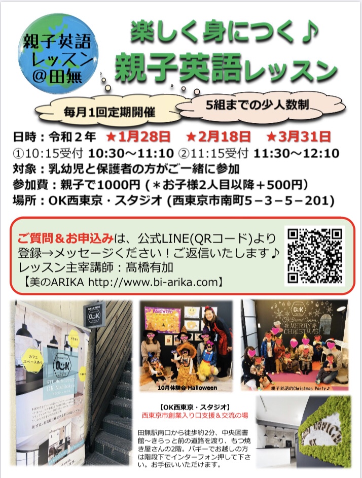 このURLをタップまたはクリックすると、楽しく身につく親子英語レッスン【田無】を友だち追加できます。