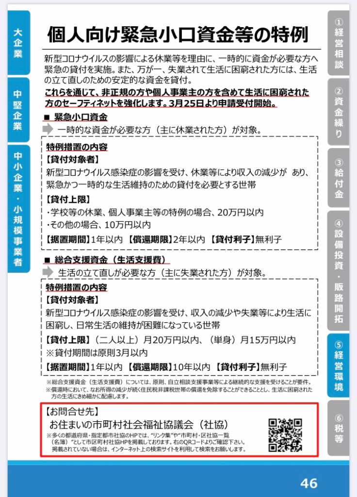 こちらは、非正規雇用や個人事業主のセーフティネットとしての貸付金です▼社会福祉協議会さん、かなり混雑しているとの情報入っています。