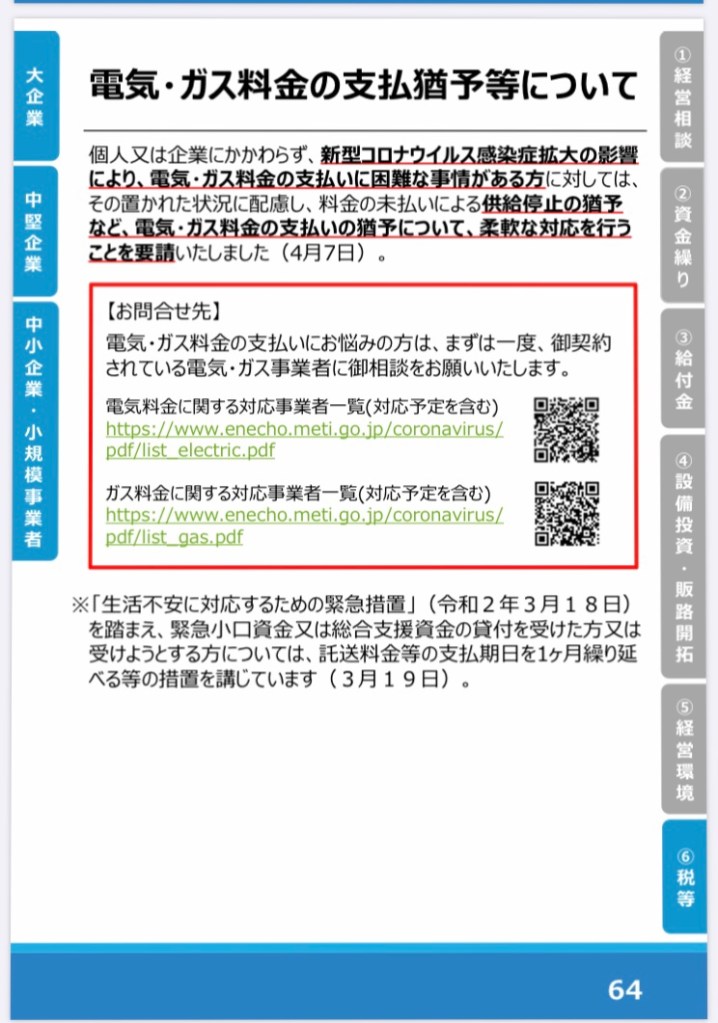 また、固定費と言えばお家賃もありますね。これも、不動産屋さん、大家さんに一度ご相談されるのも良いかと思います。因みに、大家さん支援はまだ無いと、不動産屋さんから聞いています。