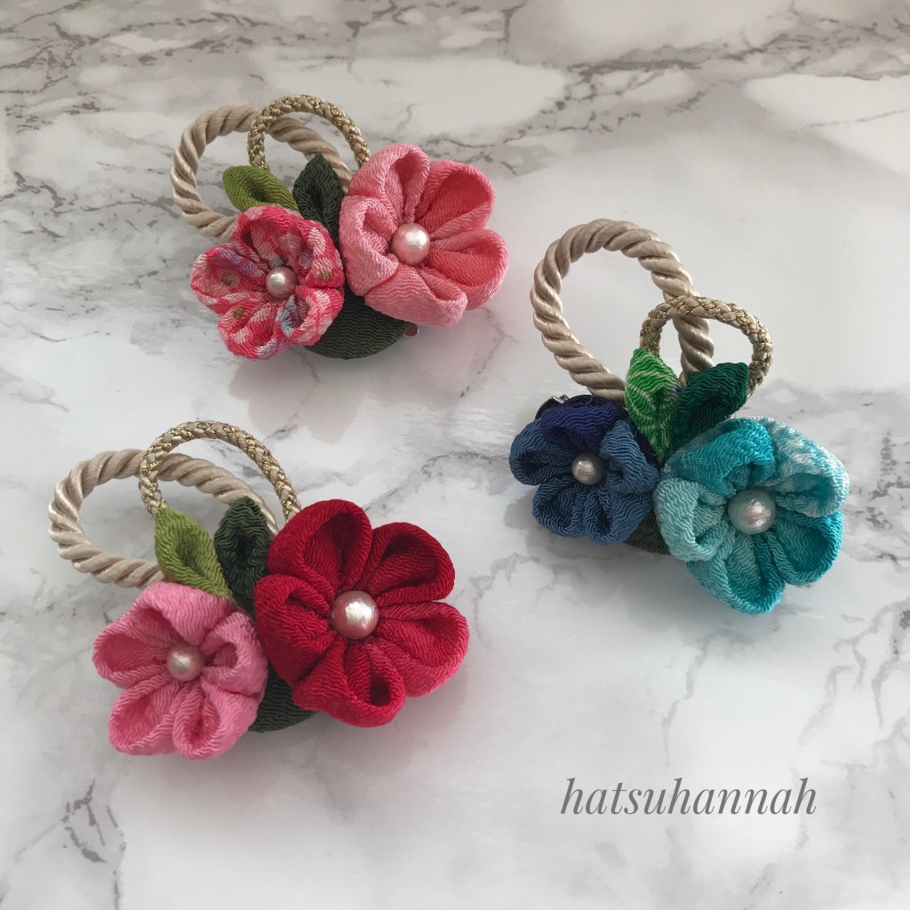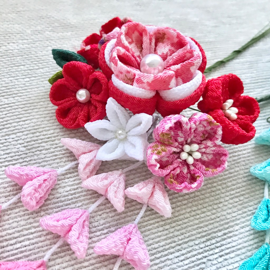 3日と10日が七五三の髪飾り、お着物に合わせて、お好きな色やお花で作る事ができます。