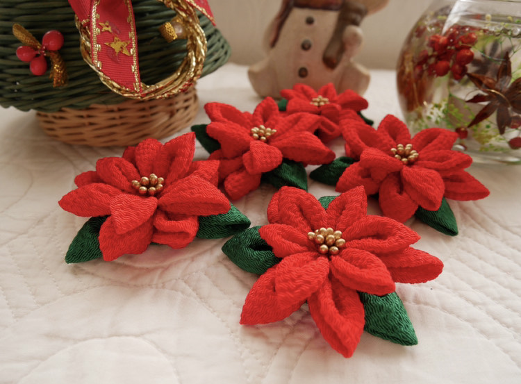② 季節の花は、もうすぐ12月なのでクリスマス用にポインセチアの2wayクリップ付きブローチを作ります。髪飾りにもブローチにもなり、赤をお色が映えます。