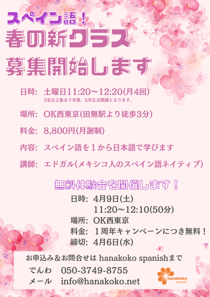 【4月開催】スペイン語教室田無校 hanakokospanish