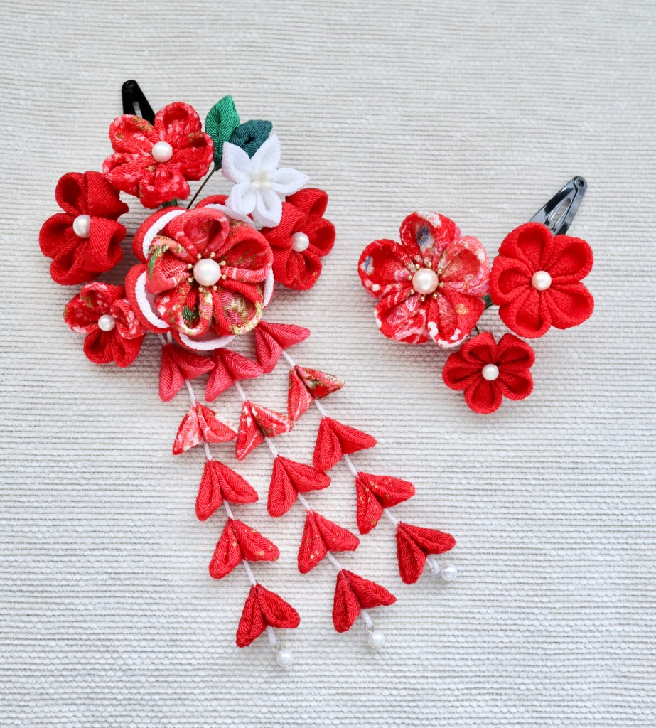 内容:布を折って糊で貼って、梅の花のブローチ&髪飾りを作ります。