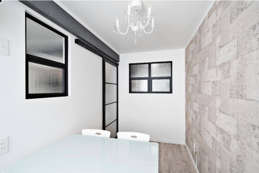 白とグレーを基調としたお部屋で、小ぶりのシャンデリアがある、